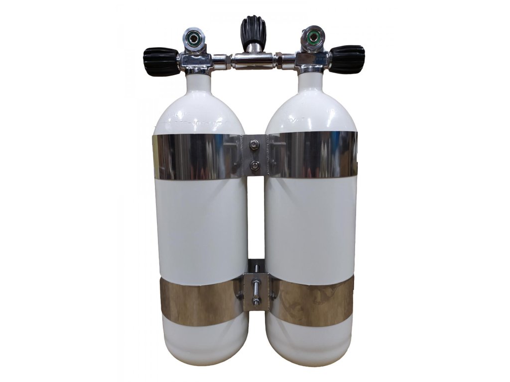 Kompletní sestava dvojče 2x5 L (300 bar) s manifoldem a ocelovými skružemi.