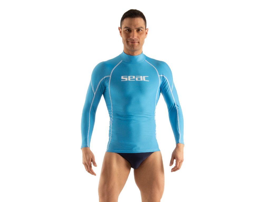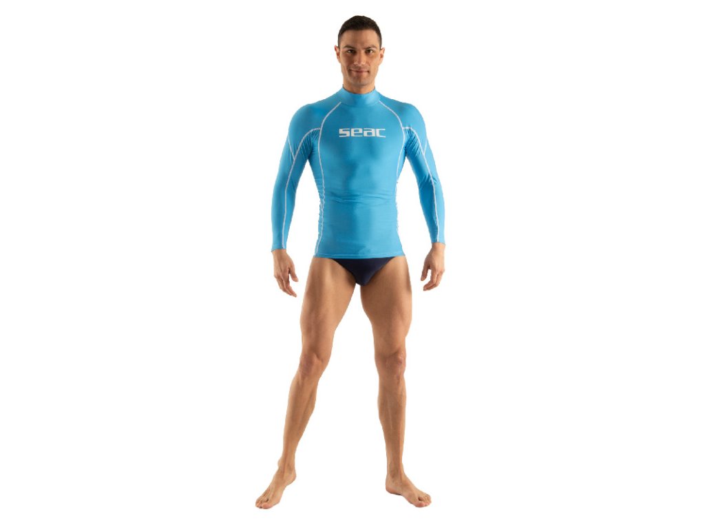 Dlouhé triko rash guard Seac RAA Evo chrání kompletně trup a paže před případnými odřeninami způsobenými třením výbavy, skalistého dna nebo kontaktem s medúzami a dalšími dráždivými živočichy.
