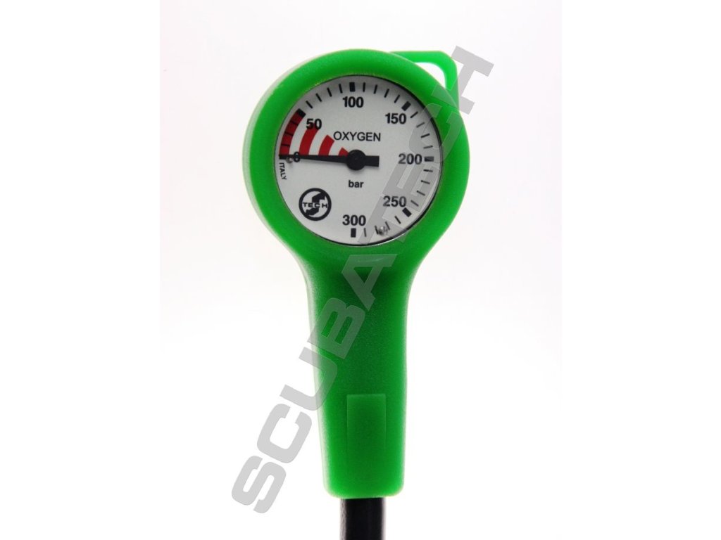 Manometr S-Tech, průměr 52 mm, O2, 300 bar, 15 cm HP hadice, zelený kryt.