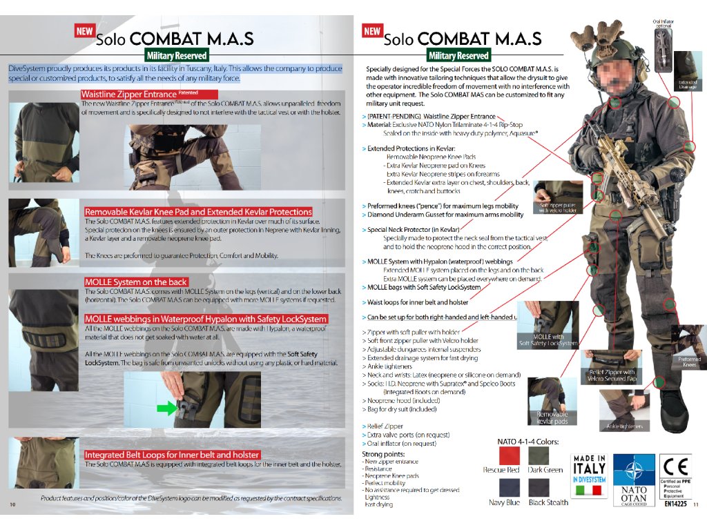 Speciálně navržený pro speciální jednotky, suchý oblek SOLO COMBAT M.A.S. je vyroben s využitím inovativních krejčovských technik, které umožňují suchému obleku poskytnout obsluze neuvěřitelnou volnost pohybu bez rušení s jiným vybavením. Oblek Solo COMBAT MAS lze přizpůsobit tak, aby vyhovoval jakýmkoli požadavkům vojenské jednotky.