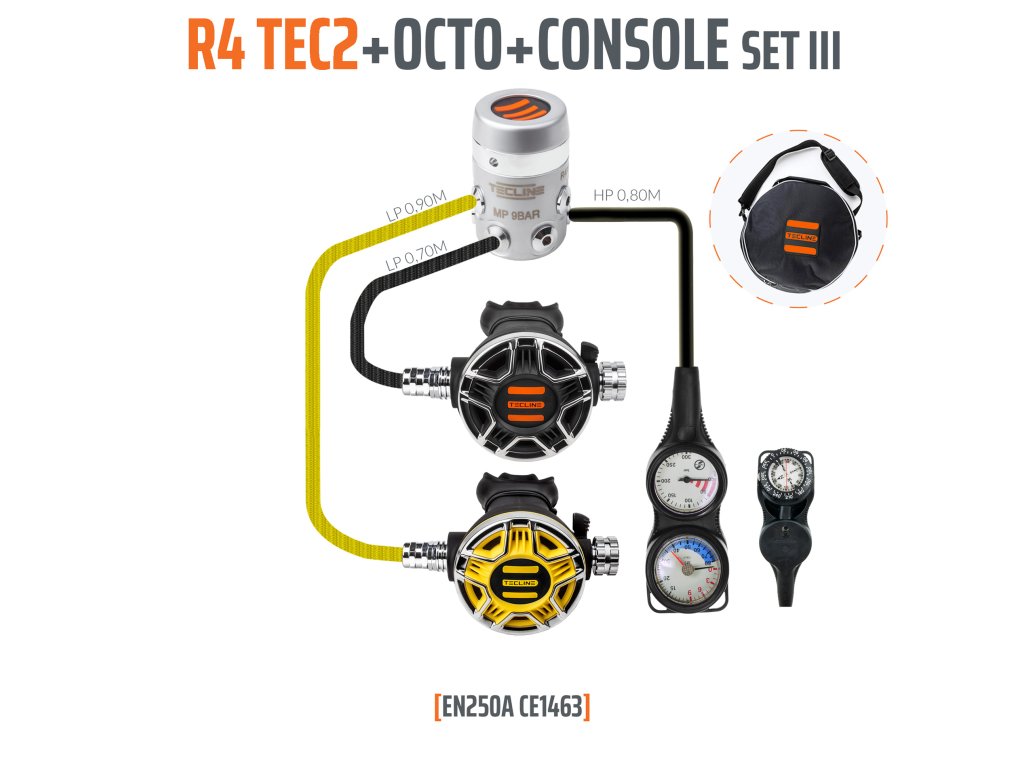 Nový rekreační set R2 TEC2 s octopusem, manometrem, hloubkoměrem a kompasem v tašce.