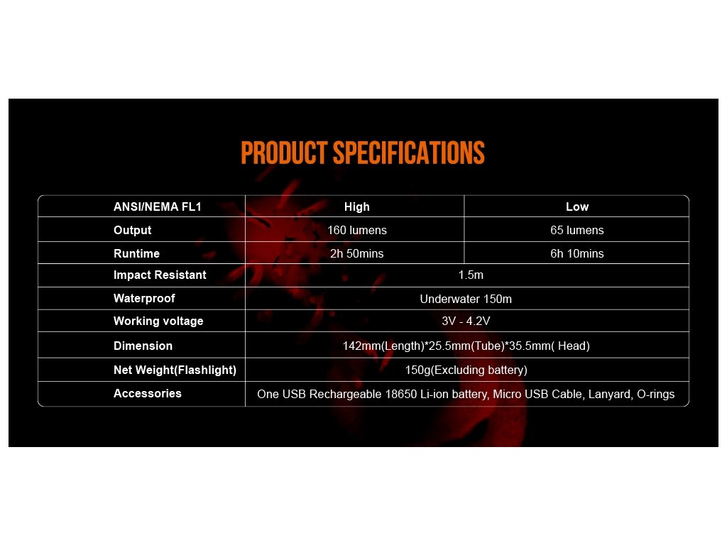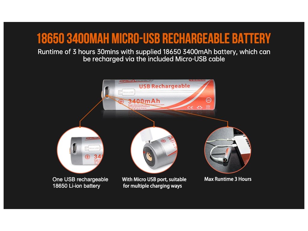 Balení obsahuje: USB baterii 18650, micro USB kábel, O-kroužek, šňůrku, manuál a záruční list.