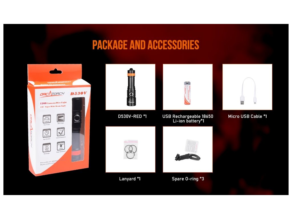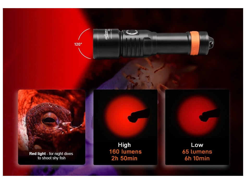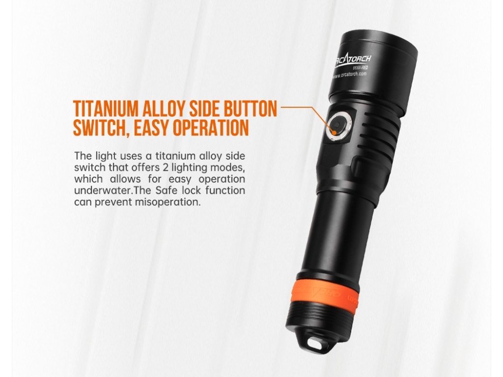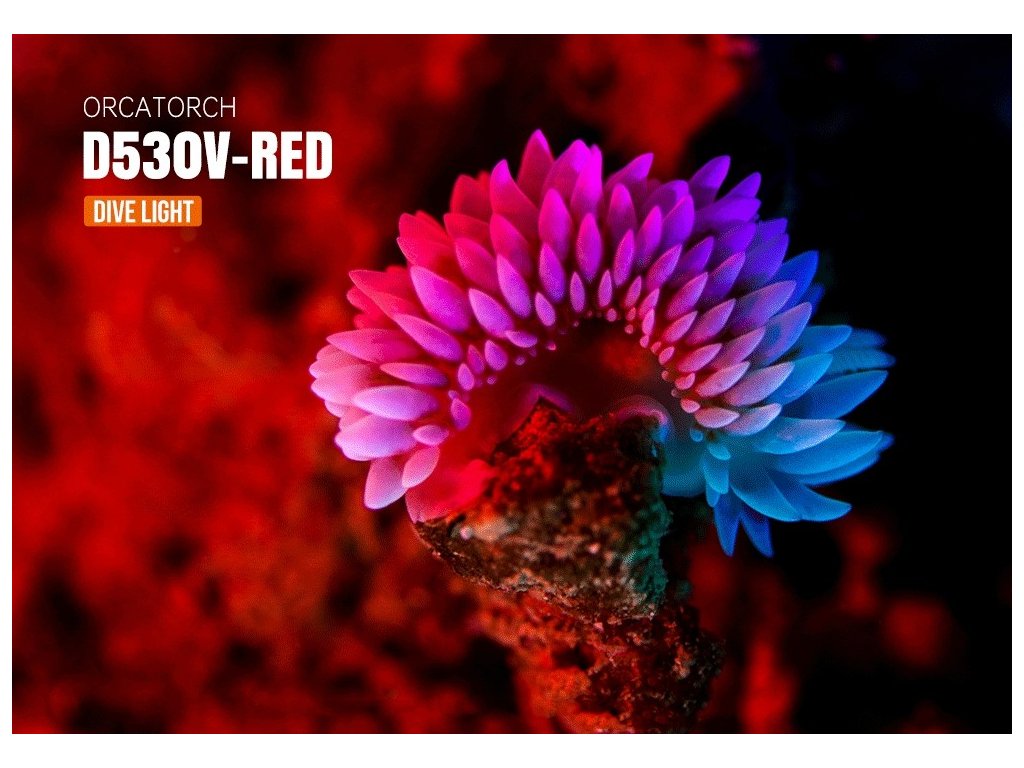 OrcaTorch D530V je profesionální potápěčské video světlo s UV paprskem, s max výstupem 160 lumenů. Má 120 ° super širokoúhlý světlomet bez slepého úhlu pro fotografování pod vodou. Světlo má boční spínač ze slitiny titanu, který nabízí 2 režimy osvětlení, což umožňuje snadné ovládání pod vodou. Kontrolka LED umístěná na tlačítku přepínače také informuje o zbývající baterii.