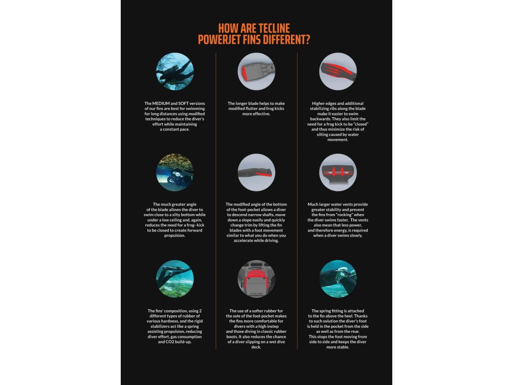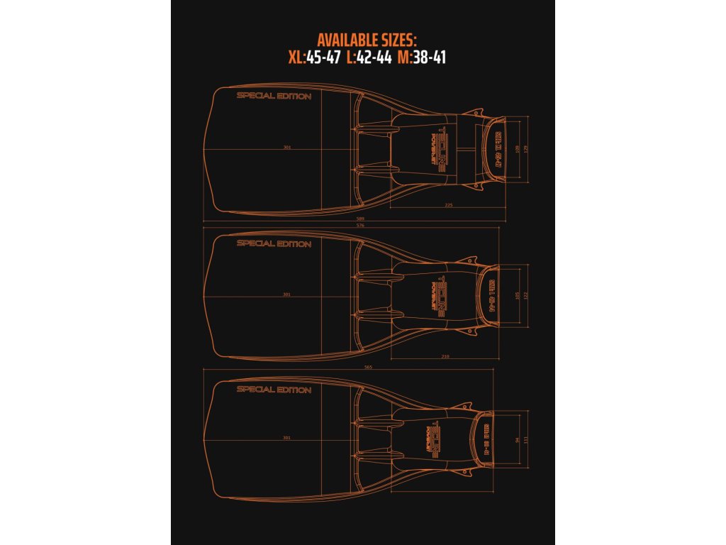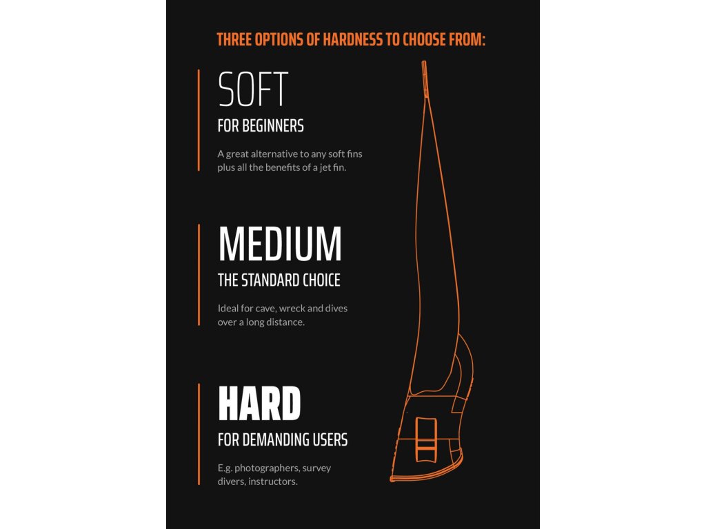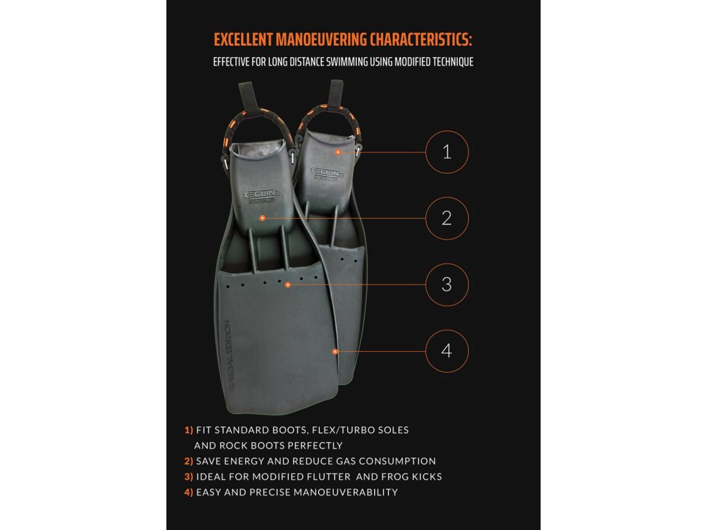 Ploutve speciálně navrženy pro technické, jeskynní a vrakové potápěče. Váha nad vodou 1,65 kg, váha pod vodou 0,35 kg. 3 stupně tvrdosti.