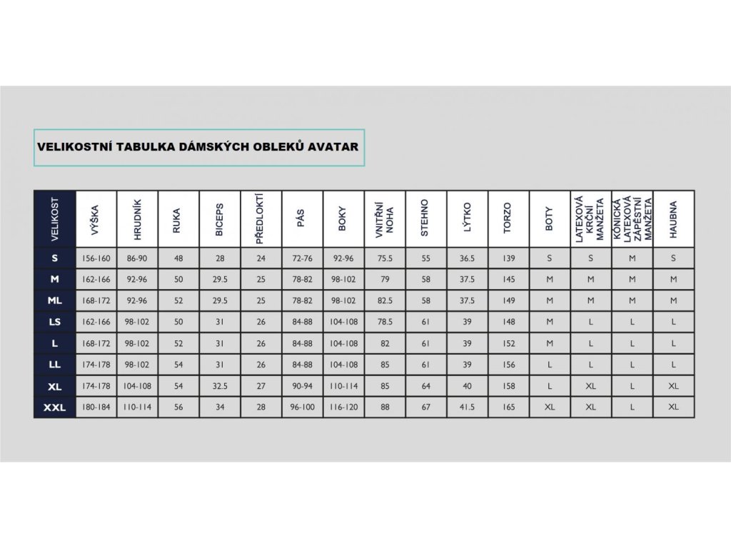 Oblek Avatar je k dispozici pouze v konfiguraci standardní velikosti. Nezapomeňte, že manžetu na krku a zápěstí lze správně oříznout na požadovanou velikost ostrým nožem nebo nůžkami podél značek na latexu.