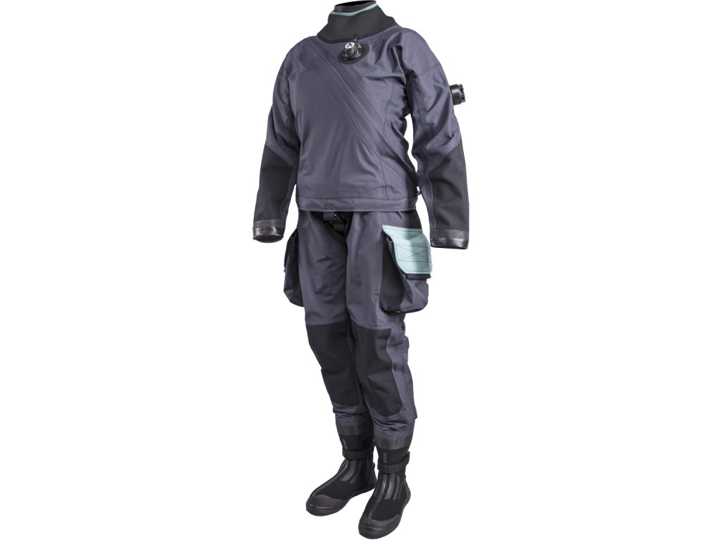 Dámský typ má umístěn zip z pravého ramene na levý bok, což umožňuje posunutí vypouštěcího ventilu u žen do lepší pozice na ruce a tím zajistit větší rychlost a bezpečnost vypouštění. Latexová krční manžeta je chráněna neoprenovým kolárkem, který zároveň slouží jako tepelný izolant na krk a cévy, přesah na límec neoprenová haubny.